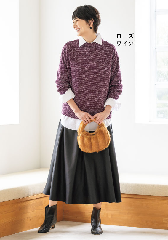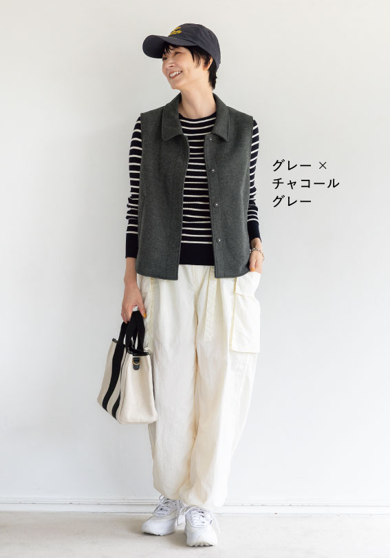 上のセーターをはじめ、あらゆるトップスに合う一枚。