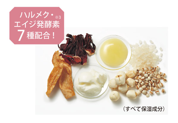 ※1:セイヨウナシ果汁発酵液、ホエイ(2)、加水分解ヒアルロン酸、ハス種子乳酸菌発酵液、ハイビスカス花発酵液、ローヤルゼリー発酵液