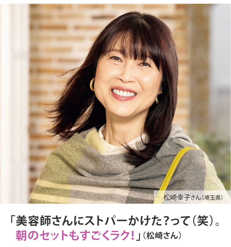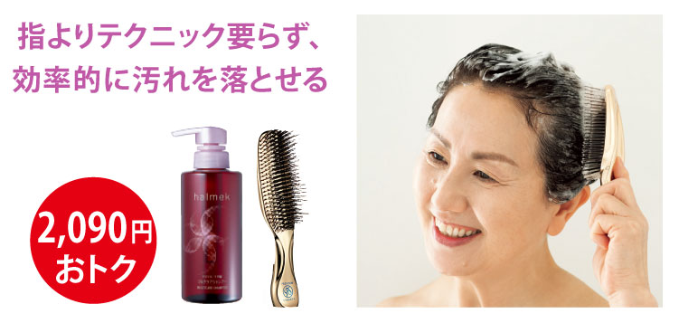 「ブラシを使ったシャンプーを私は強くおすすめしています。特にこのブラシはピンの数も多く頭に密着する形なので、くまなく汚れが落とせる。もちろんシャンプー選びも大事! ハルメクのシャンプーは細った髪にたんぱく質を補えるので、髪がふんわりします」(野毛さん)