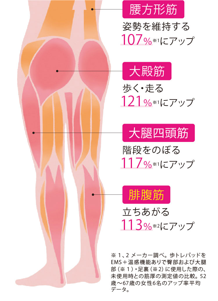 ※名古屋市立大学調べ。「コアウォークサポーター アジャスト」と「靴下のみ装着時」の3分間のカーペット上往復歩行動作時の大殿筋、腹斜筋、下腿三頭筋、内転筋の筋活動量を比較。女性3名、男性2名、 合計5名のアップ率平均データ。 ※筋活動量増域には個人差があります。