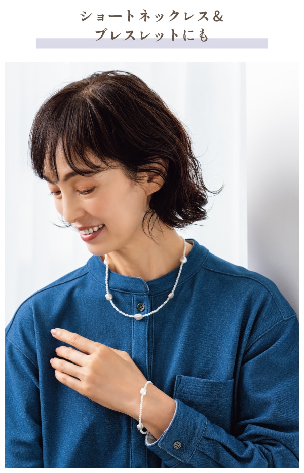 ランダムな形で輝きを放つバロックパールをぜいたくに配置し、厚着の季節にさりげない華やかさをプラスします。小さい粒の方はシェルで、上品かつ軽やかなつけ心地です。