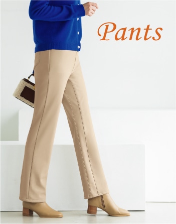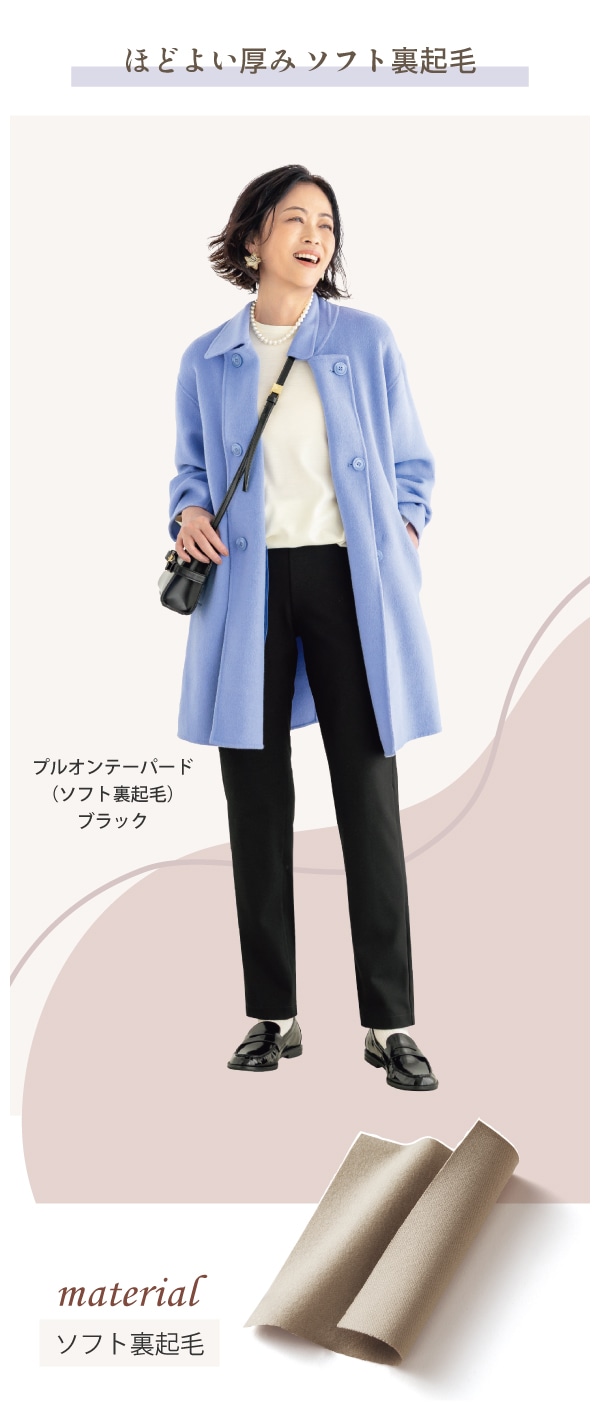 表側はシャキッときれい見え。 裏面はふんわり起毛であたたかく。 前ページの“裏シャギー”より分厚くない 軽やかなはき心地です。