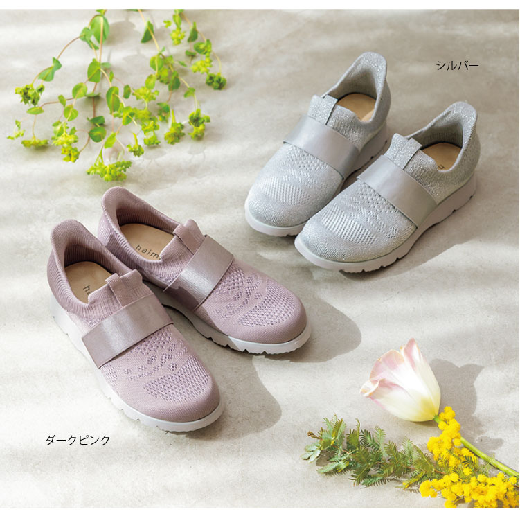 ライニング(裏材)は柔らかい生地に薄いスポンジを入れ、足指まわりをソフトに包み込んでくれる履き心地。女性らしさがあり、コンパクトに見えるシルエットです。足に吸い付くようなホールド感。長く歩いても歩きやすいクッション性のあるアウトソールを採用しました。●甲材にメッシュ素材を使うことで、外反母趾でもフィットしやすい。靴内側は、薄いスポンジ入りで足指まわりがソフトな履き心地