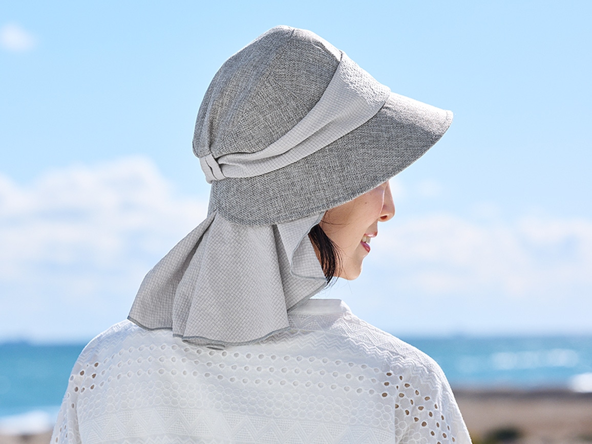 年々つらく感じる日差し、だけど買い物帰りや旅先など、両手がふさがって日傘をさすのが難しい時もありますよね。熱中症対策を念入りにしたいのが首の後ろですね。こちらの帽子は後部にカーテンのように付けた布が、直射日光からしっかり守ります。