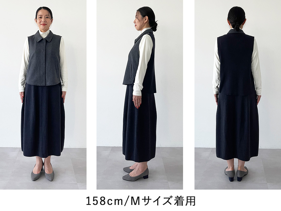 トレンドのジャケットスタイルを「袖なし」にして大人世代が使いやすく。前は厚手の素材できちんと感をもたせつつ、うしろはニットのリブ素材で動きやすさとデザイン性を追求。よそゆきにもふだんのおでかけにも重宝します。