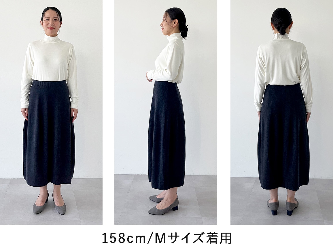 スムース編みで仕立てたスカート。やわらかな素材ながら、コクーンシルエットで脚のラインを目立たせません。深みのあるチャコール色は、黒よりも軽やかで品のある趣き。カジュアルにもきれいめにも使えます。