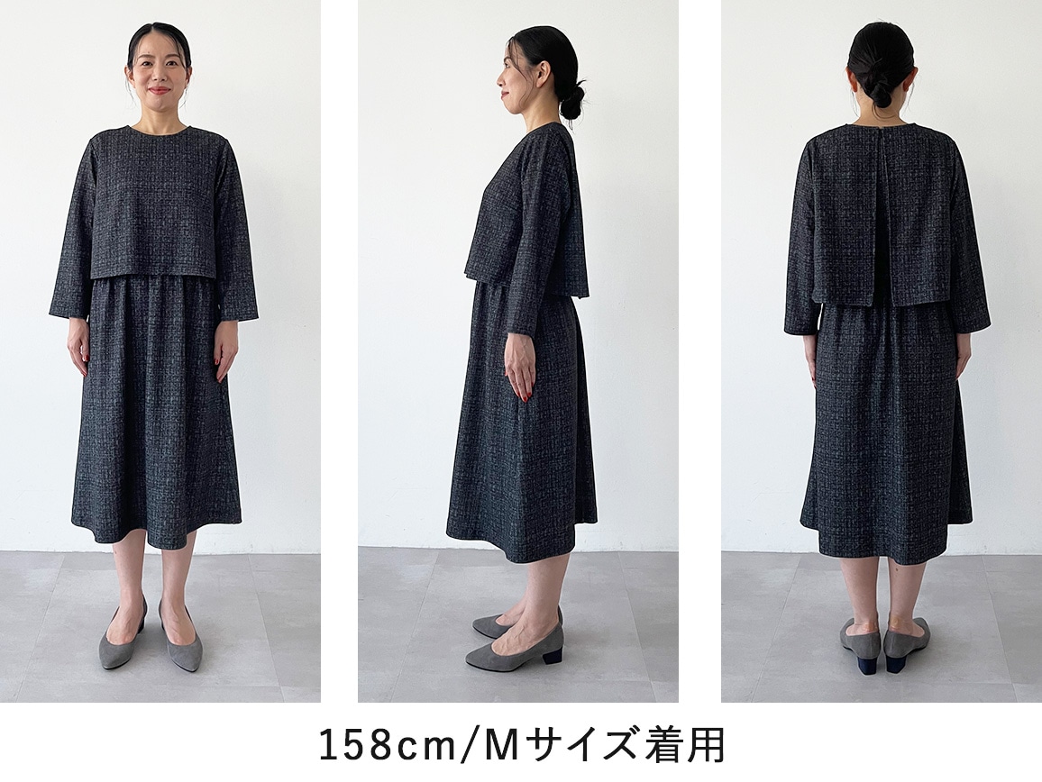上下のセットアップ風に見えるデザイン。いつものお出かけはもちろん、ちょっと特別な日にもコーデに悩まず一枚できまる“ちょっといい”ワンピースです。袖は九分丈で軽やかさも。ツイードのように見えて、着心地はやさしいジャージー素材。凹凸感のある生地にプリントを施し、上品さとラクさを両立しました。