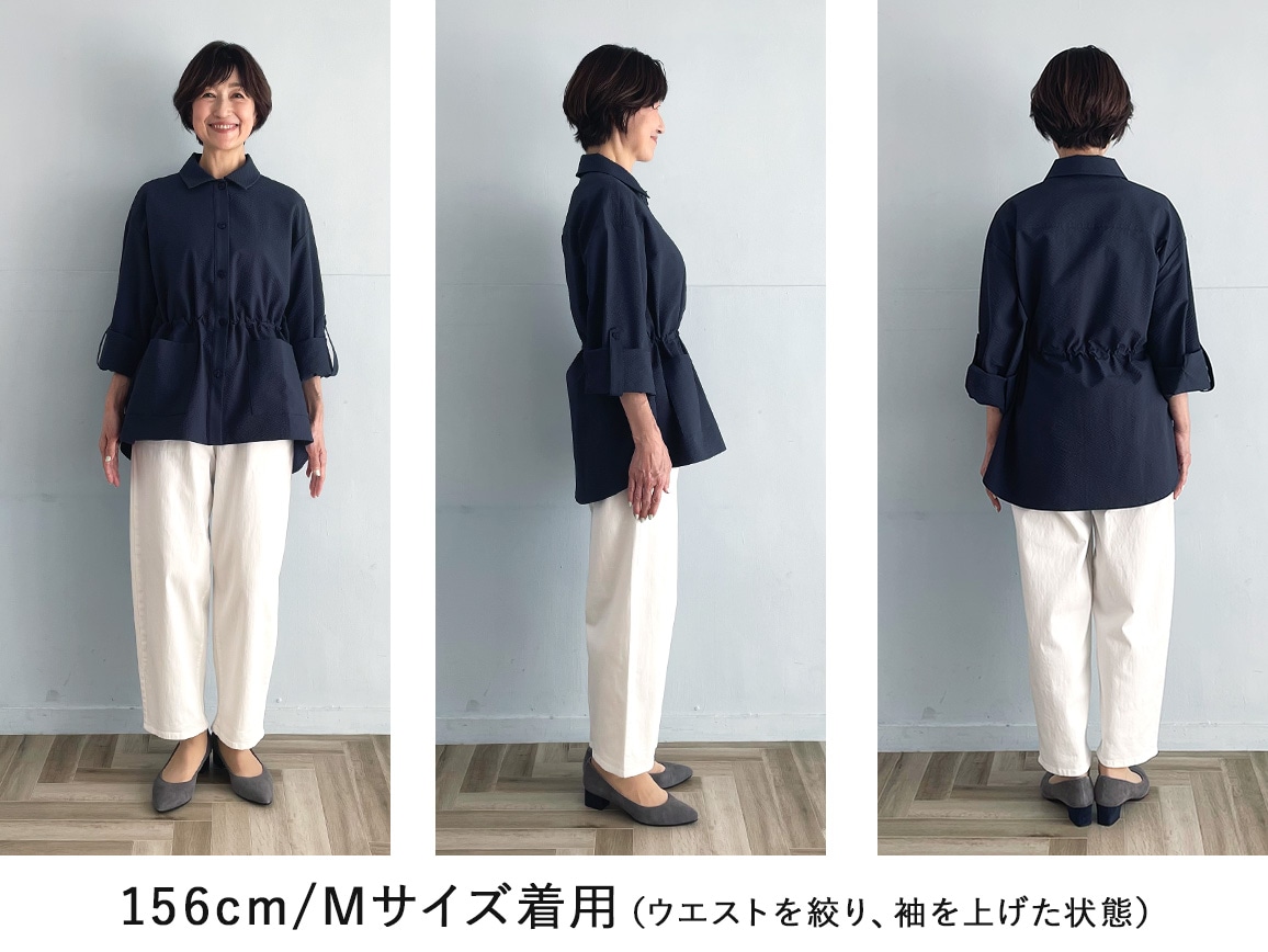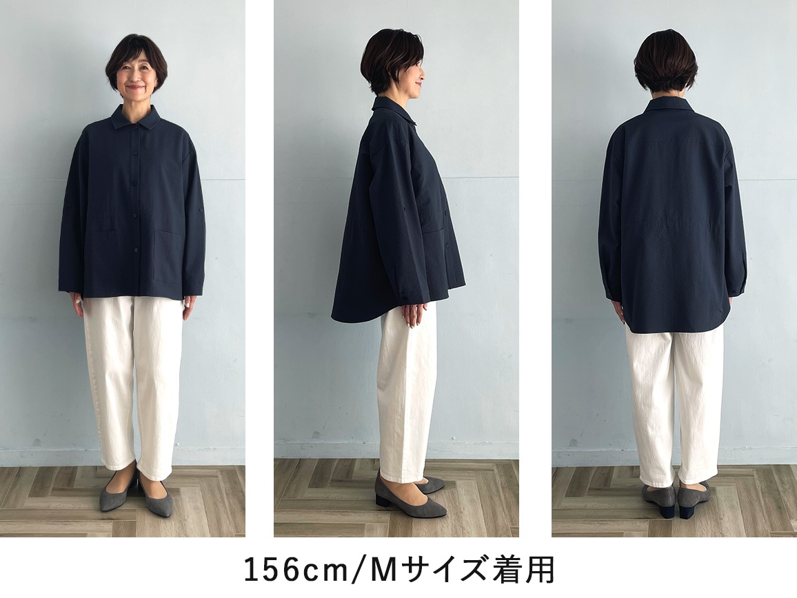 春の日差しや梅雨にも強い機能性ですが、軽やかなサッカー生地でアウトドア感なく着られます。袖の折り返しタブや、ウエストの絞りを変えられるドロストつきで、いろんな雰囲気に着こなせます。