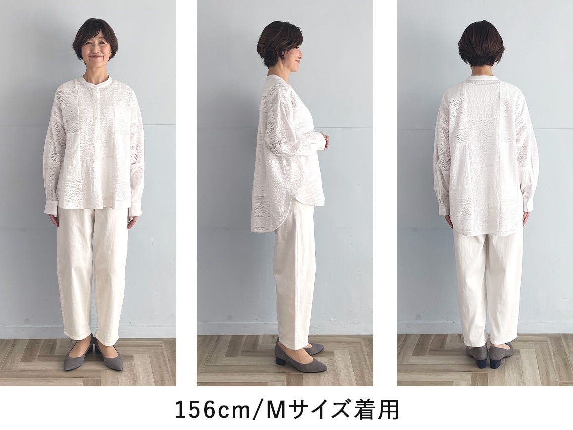 インドのレースや刺しゅう生地をパッチワーク使いしたぜいたく感あるブラウス。それぞれ違う透け感の素材が、繊細で上品な印象を作ります。バンドカラーで顔まわりも涼しげに。