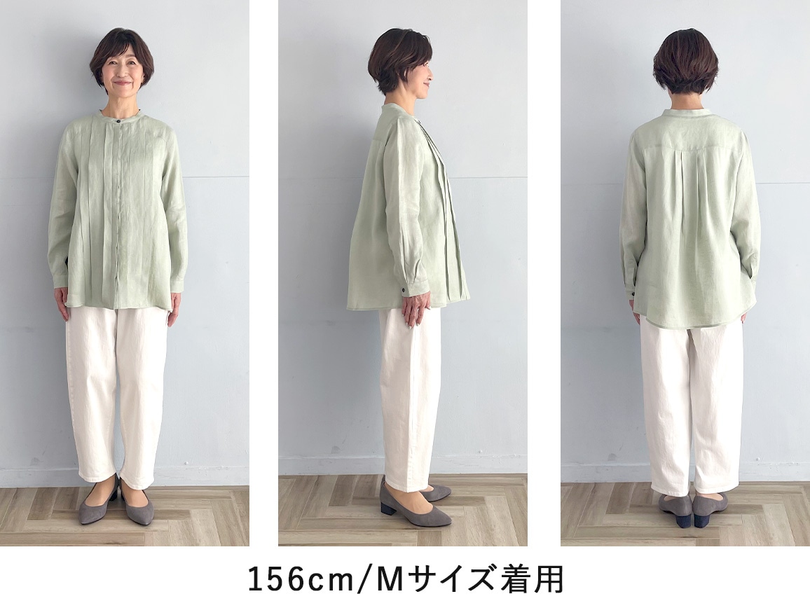 春らしいきれい色×上品なつやのあるリネンで、大人が着やすい一枚に。身ごろには、位置や幅を計算したタックを入れたことで、着るだけで立体的に体をカバーし、美しく見せます。