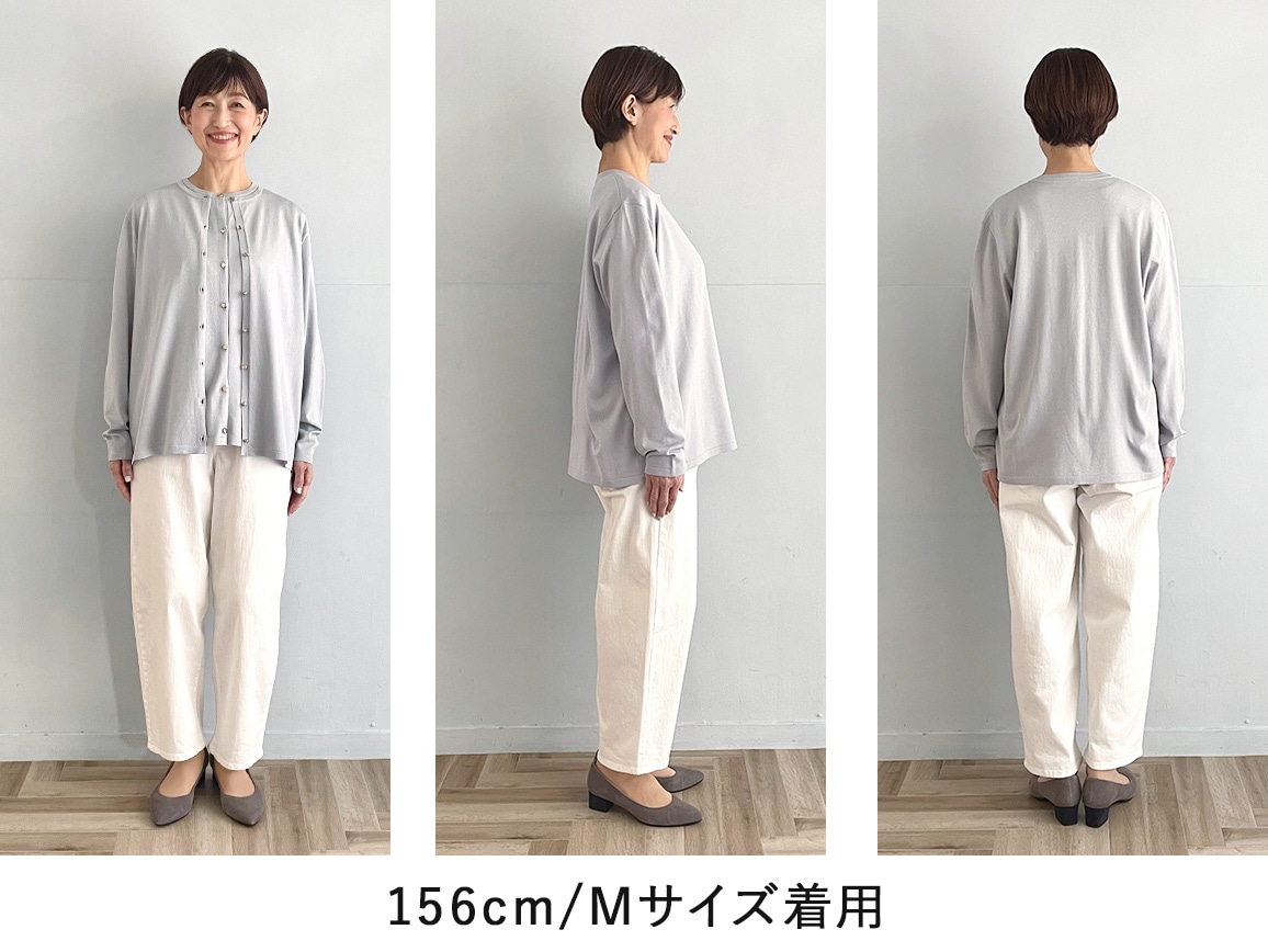 フェイスラインに沿う丸襟。シンプルな長袖で、季節をつなぐはおりものとして重宝。